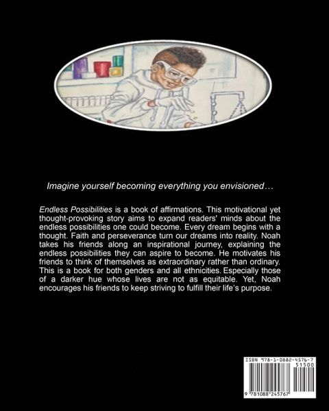 Endless Possibilities is a book of affirmations. This motivational yet thought-provoking story aims to expand readers' minds about the endless possibilities one could become. Every dream begins with a thought. Faith and perseverance turn our dreams into reality. Noah takes his friends along an inspirational journey, explaining the endless possibilities they can aspire to become. He motivates his friends to think of themselves as extraordinary rather than ordinary. This is a book for both genders and all ethnicities. Especially those of a darker hue whose lives are not as equitable.Yet, Noah encourages his friends to keep striving to fulfill their life's purpose.