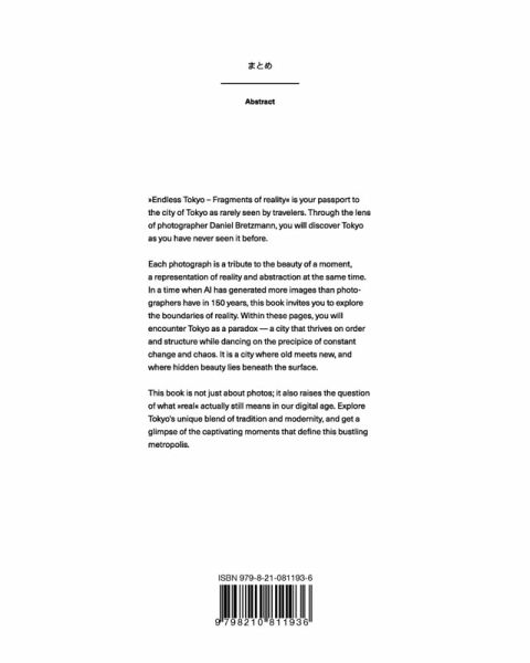 Endless Tokyo - Fragments of reality is your passport to the city of Tokyo as rarely seen by travelers. Through the lens of photographer Daniel Bretzmann, you will discover Tokyo as you have never seen it before. Each photograph is a tribute to the beauty of a moment, a representation of reality and abstraction at the same time. In a time when AI has generated more images than photographers have in 150 years, this book invites you to explore the boundaries of reality. Within these pages, you will encounter Tokyo as a paradox - a city that thrives on order and structure while dancing on the precipice of constant change and chaos. It is a city where old meets new, and where hidden beauty lies beneath the surface. This book is not just about photos; it also raises the question of what real actually still means in our digital age. Explore Tokyo's unique blend of tradition and modernity, and get a glimpse of the captivating moments that define this bustling metropolis.
