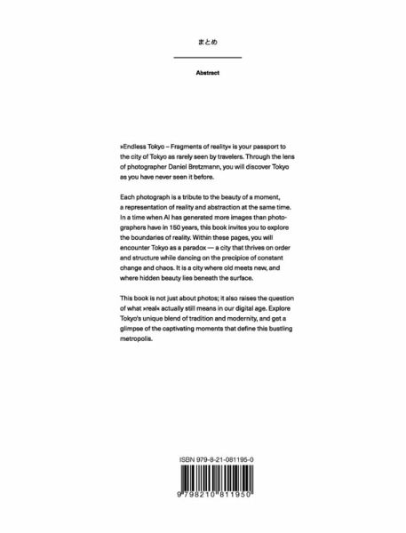 Endless Tokyo - Fragments of reality is your passport to the city of Tokyo as rarely seen by travelers. Through the lens of photographer Daniel Bretzmann, you will discover Tokyo as you have never seen it before. Each photograph is a tribute to the beauty of a moment, a representation of reality and abstraction at the same time. In a time when AI has generated more images than photographers have in 150 years, this book invites you to explore the boundaries of reality. Within these pages, you will encounter Tokyo as a paradox - a city that thrives on order and structure while dancing on the precipice of constant change and chaos. It is a city where old meets new, and where hidden beauty lies beneath the surface. This book is not just about photos; it also raises the question of what real actually still means in our digital age. Explore Tokyo's unique blend of tradition and modernity, and get a glimpse of the captivating moments that define this bustling metropolis.