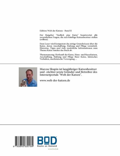 Edition Welt der Katzen - Band II Der Ratgeber "Endlich eine Katze" beantwortet alle wesentlichen Fragen, die sich künftige Katzenbesitzer stellen (sollten).Dem Leser wird kompetent das nötige Grundwissen über die Katze, deren Anschaffung, Haltung und Pflege vermittelt. Hinweise, Tipps und viele zusätzliche Informationen zum Thema Katze runden das Buch ab.Themenauszug: Herkunft der Katze, Haus- und Rassekatzen, Anschaffung, Haltung und Pflege Ihrer Katze, kätzisches Verhalten, medizinische Versorgung ...