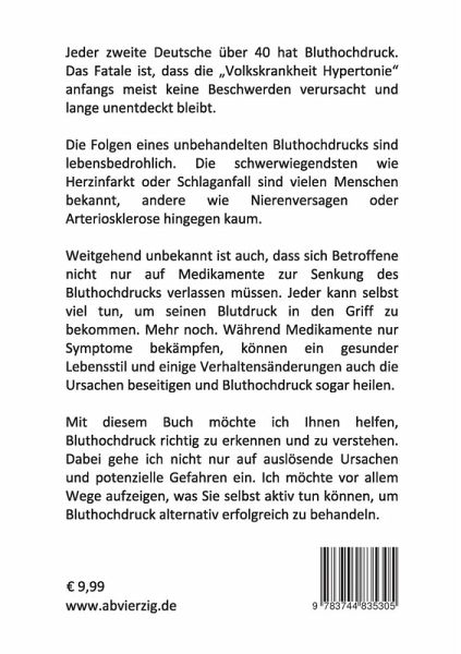 Jeder zweite Deutsche über 40 hat Bluthochdruck. Das Fatale ist, dass die Volkskrankheit Hypertonie anfangs meist keine Beschwerden verursacht und lange unentdeckt bleibt. Die Folgen eines unbehandelten Bluthochdrucks sind lebensbedrohlich. Die schwerwiegendsten wie Herzinfarkt oder Schlaganfall sind vielen Menschen bekannt, andere wie Nierenversagen oder Arteriosklerose hingegen kaum.Weitgehend unbekannt ist auch, dass sich Betroffene nicht nur auf Medikamente zur Senkung des Bluthochdrucks verlassen müssen. Jeder kann selbst viel tun, um seinen Blutdruck in den Griff zu bekommen. Mehr noch. Während Medikamente nur Symptome bekämpfen, können ein gesunder Lebensstil und einige Verhaltensänderungen auch die Ursachen beseitigen und Bluthochdruck sogar heilen.Denn letztlich ist Bluthochdruck zwar eine lebensbedrohliche Krankheit. Er ist aber auch ein guter Indikator, wie es um die eigene gesundheitliche Situation bestellt ist. Die Ursachen für Bluthochdruck können vielfältig sein. Meistens kommen verschiedene Faktoren zusammen. In den seltensten Fällen kann aber der behandelnde Hausarzt alle möglichen Ursachen nennen.Aber auch bei der Diagnose essentielle oder primäre Hypertonie gibt es durchaus Ursachen, die die Krankheit auslösen. Es fehlt meist nur an der Zeit für eine ganzheitliche Untersuchung und Therapie.Hier sind die Betroffenen selbst gefordert. Sie selbst wissen am besten, wie viel sie sich bewegen, wie sie sich ernähren und welchem Druck sie auf der Arbeit oder in der Freizeit ausgesetzt sind. All diese Faktoren können den Körper unter Druck setzen und Bluthochdruck verursachen. Einfach nur die Symptome medikamentös zu bekämpfen, ist keine Lösung. Das wäre nichts Anderes als wenn man im Brandfall beim Brandschutzmelder die Batterie ausbaut, weil der Lärm stört. Dadurch ist der Brand nicht gelöscht. Viel besser ist, man beseitigt die Ursachen und löscht das Feuer!Mit diesem Buch möchte ich helfen, Bluthochdruck richtig zu erkennen und zu verstehen.Dabei gehe ich nicht nur auf auslösende Ursachen und potenzielle Gefahren ein. Ich möchte vor allem Wege aufzeigen, was Betroffene selbst aktiv tun können, um Bluthochdruck alternativ erfolgreich zu behandeln.
