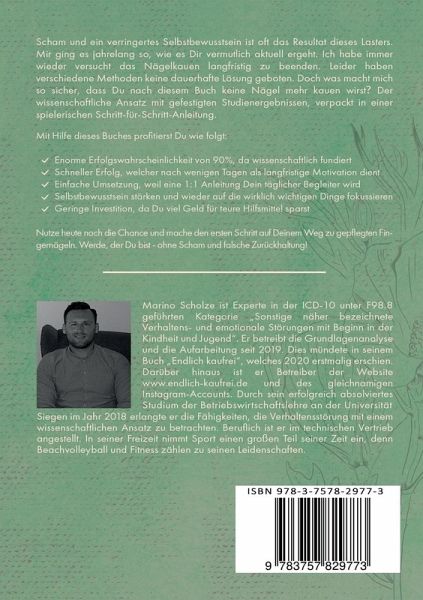 Scham und ein verringertes Selbstbewusstsein ist oft das Resultat dieses Lasters. Mir ging es jahrelang so, wie es Dir vermutlich aktuell ergeht. Ich habe immer wieder versucht das Nägelkauen langfristig zu beenden. Leider haben verschiedene Methoden keine dauerhafte Lösung geboten. Doch was macht mich so sicher, dass Du nach diesem Buch keine Nägel mehr kaufen wirst? Der wissenschaftliche Ansatz mit gefestigten Studienergebnissen, verpackt in einer spielerischen Schritt-für-Schritt-Anleitung.Mit Hilfe dieses Buches profitierst Du wie folgt:- Enorme Erfolgswahrscheinlichkeit von 90%, da wissenschaftlich fundiert - Schneller Erfolg, welcher nach wenigen Tagen als langfristige Motivation dient - Einfache Umsetzung, weil eine 1:1 Anleitung Dein täglicher Begleiter wird - Selbstbewusstsein stärken und wieder auf die wirklich wichtigen Dinge fokussieren - Geringe Investition, da Du viel Geld für teure Hilfsmittel sparst Nutze heute noch die Chance und mache den ersten Schritt auf Deinem Weg zu gepflegten Fingernägeln. Werde, der Du bist - ohne Scham und falsche Zurückhaltung!
