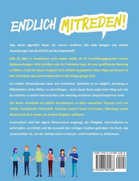 In Deutschland wird der Wert einer guten Allgemeinbildung extrem hoch eingestuft. Einer repräsentativen Studie zufolge halten 97 % der Bundesbürger Allgemeinbildung für "sehr wichtig". Rund 60 % der Befragten geben an, dass eine gute Allgemeinbildung die Attraktivität beim anderen Geschlecht erhöht. Neueste Studien zeigen, dass Menschen mit guter Allgemeinbildung über ein besonders gut vernetztes Gehirn verfügen - Lernfähigkeit und Gedächtnis bleiben somit bis ins hohe Alter erhalten. Daneben bringt dir eine solide Allgemeinbildung weitere Vorteile:Du wirkst automatisch selbstbewusster und kannst in ganz verschiedenen Situationen souverän Smalltalk führen. Allgemeinbildung lässt dich im täglichen Leben kompetent wirken und gilt beim anderen Geschlecht als sexy. Kannst du auf eine solide Allgemeinbildung zurückgreifen, fällt es dir leichter, neue Dinge zu lernen, einzuschätzen und zu bewerten. Du erkennst leichter Zusammenhänge und bist besser im Finden von unkonventionellen Lösungen. Bist du der Meinung, dass du Wissenslücken hast, die dich manchmal im Gespräch ganz schön alt aussehen lassen? Wenn du das ändern willst, hast du mit diesem Buch den richtigen Ratgeber gefunden. Das erfährst du im Buch:Wortschatz auf dem Prüfstand: Erfahre, wie du deine Ausdrucksweise deinen Gesprächspartnern anpasst und erhalte die ultimative Liste der Wörter, die dich unglaublich eloquent erscheinen lassen! Plus: Begriffe aus dem Englischen und Französischen, die du kennen musst! Kompetent erklärt und direkt bereit zur Anwendung! Schöne neue Welt und keinen Plan davon? Lese das Kapitel im Buch über neue Technologien und die Wissenschaft - am Ende erklärst du den anderen, welchen Erfindungen die Zukunft gehört, was es mit der DSGVO auf sich hat und welche Unternehmen Potenzial ohne Ende haben. Die schönsten Reiseziele auf der Erde, Deutschlands beste Ecken für einen Kurztrip und die Vorteile, mit dem Rucksack durch die Welt zu touren - vergrößere dein Wissen über die Welt und werde damit zum kompetenten Ratgeber für deine Mitmenschen! Nie wieder die Flucht ergreifen, wenn politische Themen aufs Parkett kommen: Dieses Buch hilft dir dabei, nicht nur die Politik in Deutschland und der Welt zu verstehen, sondern auch schlagfertig zu diskutieren! Nur weil die Welt der Wirtschaft und Finanzen für dich bislang ein Buch mit sieben Siegeln war, muss das nicht so bleiben - wenige Buchseiten helfen dir dabei, zum Insider zu werden! Mit Freundinnen auf Augenhöhe diskutieren oder bei Frauen gut ankommen: Eigne dir das perfekte Basiswissen rund um die Themen Spiritualität, Gesundheit und Ernährung sowie Kultur und Unterhaltung an! Dieses Buch eröffnet dir ungeahnte Möglichkeiten. Erfahre, wie du Wissen vernetzt, mit Quellen richtig umgehst und am Ende Gespräche in die von dir gewünschte Richtung lenkst! Bist du bereit für den nächsten, aufregenden Abschnitt in deinem Leben? Wenn du nie wieder ratlos in der Ecke stehen möchtest, sondern umschwärmter Mittelpunkt am Arbeitsplatz und im Freundeskreis werden möchtest, dann kaufe dir jetzt unbedingt dieses Buch!