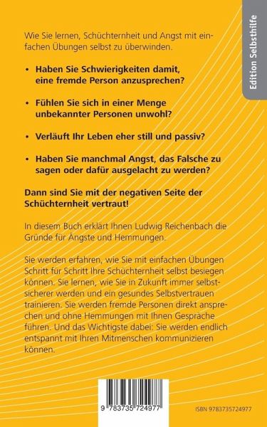 Wie Sie lernen, Schüchternheit und Angst mit einfachen Übungen selbst zu überwinden.-Haben Sie Schwierigkeiten damit, eine fremde Person anzusprechen? -Fühlen Sie sich in einer Menge unbekannter Personen unwohl?-Verläuft Ihr Leben eher still und passiv? -Haben Sie manchmal Angst, das Falsche zu sagen oder dafür ausgelacht zu werden?Dann sind Sie mit der negativen Seite der Schüchternheit vertraut!In diesem Buch erklärt Ihnen Ludwig Reichenbach die Gründe für Ängste und Hemmungen. Sie werden erfahren, wie Sie mit einfachen Übungen Schritt für Schritt Ihre Schüchternheit selbst besiegen können. Sie lernen, wie Sie in Zukunft immer selbstsicherer werden und ein gesundes Selbstvertrauen trainieren. Sie werden dann fremde Personen direkt ansprechen und ohne Hemmungen mit Ihnen Gespräche führen. Und das Wichtigste dabei: Sie werden endlich entspannt mit Ihren Mitmenschen kommunizieren können.