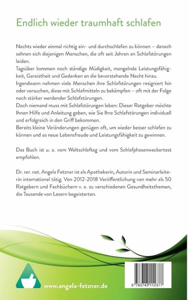 Nachts wieder einmal richtig ein- und durchschlafen zu können - danach sehnen sich diejenigen Menschen, die oft seit Jahren an Schlafstörungen leiden.Tagsüber kommen noch ständige Müdigkeit, mangelnde Leistungsfähigkeit, Gereiztheit und Gedanken an die bevorstehende Nacht hinzu.Irgendwann nehmen viele Menschen ihre Schlafstörungen resigniert hin oder versuchen, diese mit Schlafmitteln zu bekämpfen - oft mit der Folge noch stärker werdender Schlafstörungen.Doch niemand muss mit Schlafstörungen leben: Dieser Ratgeber möchte Ihnen Hilfe und Anleitung geben, wie Sie Ihre Schlafstörungen individuell und erfolgreich in den Griff bekommen.Bereits kleine Veränderungen genügen oft, um wieder besser schlafen zu können und so neue Lebensfreude und Leistungsfähigkeit zu gewinnen.Das Buch ist u. a. von "Gesundheit und Medizin - Das Gesundheitsportal" empfohlen (http://www.gesundheitundmedizin.de/buecher.asp?Suche=Schlafst%F6rungen), sowie vom Weltschlaftag und vom Schlafphasenweckertest.4. erweiterte Auflage 2019Die Autorin Dr. Angela Fetzner berät und informiert als promovierte Apothekerin seit fast zwei Jahrzehnten zahlreiche Kunden.