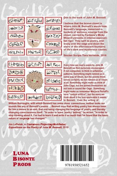 Contents of this book include poems written by the author February through May, 2016. Interspersed throughout are a series of eight visual poems written in the author's signature calligraphy with rubber stampings. Sinclair Scripa aka Tara Verheide, wrote the following: "Ode to the work of John M. Bennett; I believe that the broom closet is where John M. Bennett's words hide. Bennett's language, immersed in buckets of wetness, emerge from the closet, carried by Fantasia's Micky Wizard's brooms in intense exponential rigor. They spill as poetry, endlessly over the edge and down the stairs of the…mehr