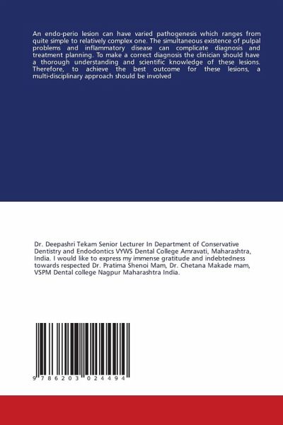 An endo-perio lesion can have varied pathogenesis which ranges from quite simple to relatively complex one. The simultaneous existence of pulpal problems and inflammatory disease can complicate diagnosis and treatment planning. To make a correct diagnosis the clinician should have a thorough understanding and scientific knowledge of these lesions. Therefore, to achieve the best outcome for these lesions, a multi disciplinary approach should be involved
