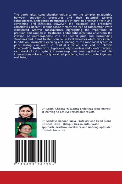 The books gives comprehensive guidance on the complex relationship between endodontic procedures and their potential systemic consequences. Endodontic treatments are integral to preserving teeth and eliminating oral infections. However, the biological and procedural complexities inherent in endodontic therapy can lead to complications with widespread systemic consequences, highlighting the importance of precision and caution in treatment. Endodontic infections arise from the invasion of microorganisms into the dental pulp and surrounding structures and, if not treated, can cause local abscesses which may spread. In addition, incomplete cleaning and shaping of the root canal system or poor sealing can result in residual infection and lead to chronic inflammation. Furthermore, hypersensitivity to certain endodontic materials can provoke local or systemic immune responses. ensuring that endodontic interventions solve not only localized problems, but also protect general well being.