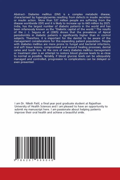 Abstract- Diabetes mellitus (DM) is a complex metabolic disease, characterised by hyperglycaemia resulting from defects in insulin secretion or insulin action. More than 537 million people are suffering from the disease worldwide (IDF) and it is likely to increase up to 643 million by 2025. India, has the largest number of diabetic patients in the world and has been infamously known as the "Diabetic capital of the world." The results of the J. J. Segura et al (2005) shows that the prevalence of Apical periodontitis in diabetic patients is significantly higher than in control subjects. Therefore, it is important for the dentist to be aware of the management considerations for this expanding patient population. People with diabetes mellitus are more prone to fungal and bacterial infections, oral soft tissue lesions, compromised oral wound healing processes, dental caries and tooth loss. At the core of every diabetes mellitus management or treatment plan is an attempt to restore blood glucose levels to as close to normal as possible. Notably, if blood glucose levels can be adequately managed and controlled, progression to complications can be delayed or even prevented.