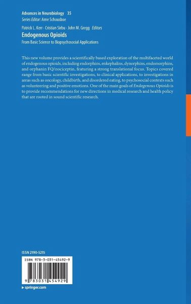 Introduction to the volume: The Journey Ahead.- The Foundational Science of Endogenous Opioids and Their Receptors.- Interactions Between Endogenous Opioids and the Immune system.- The Opioid Growth Factor in Growth Regulation and Immune Responses in Cancer.- Role of Endorphins in Breast Cancer Pathogenesis and Recovery.- Modulatory Processes in Craniofacial Pain States.- Enkephalin Rescues Temporomandibular Joint Pain Related Behavior in Rats.- Endogenous Opioids and Exercise-Related Hypoalgesia: Modern Models, Measurement, and Mechanisms of Action.- Pain, Fear, Anxiety, and Stress: Relation to the Endogenous Opioid System.- The Roles of Endogenous Opioids in Placebo and Nocebo Effects: From Pain to Performance to Prozac.- Physical Exercise as an Intervention for Depression: Evidence for Efficacy and Mu-Opioid Receptors as a Mechanism of Action.- The Endogenous Opioid System as a Pathway of Positive Emotions.- Endogenous Opioids and Volunteering: On the Evolutionary Significance ofHelping Others.- Endogenous and Exogenous Opioids: Role in Substance Use Disorders.- Endogenous Opioid Activity as the Mechanism of Action for Mitragyna Speciosa (Kratom): The Current State of the Evidence.- Endogenous Opioids in the Homeostatic Regulation of Hunger, Satiety, and Hedonic Eating: Neurobiological Foundations.- Role of Endogenous Opioids in the Pathophysiology of Obesity and Eating Disorders.- Integration of Endogenous Opioid System Research in the Interprofessional Diagnosis and Treatment of Obesity and Eating Disorders.- The Role of Endogenous Opioids in Cardioprotection.- Endorphins, Sexuality, and Reproduction.- Depression, Cancer, Inflammation, and Endogenous Opioids: Pathogenic Relationships and Therapeutic Options.