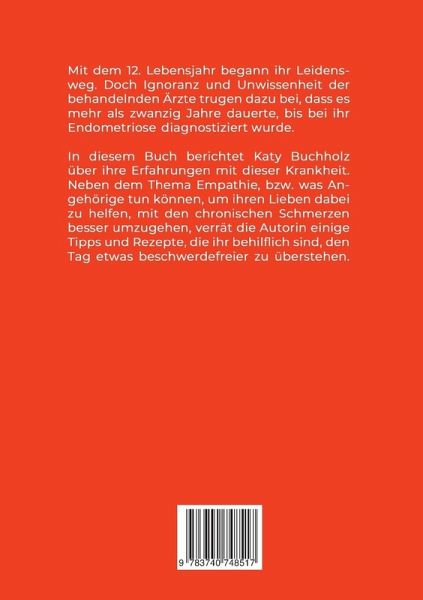 Mit dem 12. Lebensjahr begann ihr Leidensweg. Doch Ignoranz und Unwissenheit der behandelnden Ärzte trugen dazu bei, dass es mehr als zwanzig Jahre dauerte, bis bei ihr Endometriose diagnostiziert wurde. In diesem Buch berichtet Katy Buchholz über ihre Erfahrungen mit dieser Krankheit. Neben dem Thema Empathie, bzw. was Angehörige tun können, um ihren Lieben dabei zu helfen, mit den chronischen Schmerzen besser umzugehen, verrät die Autorin einige Tipps und Rezepte, die ihr behilflich sind, den Tag etwas beschwerdefreier zu überstehen.