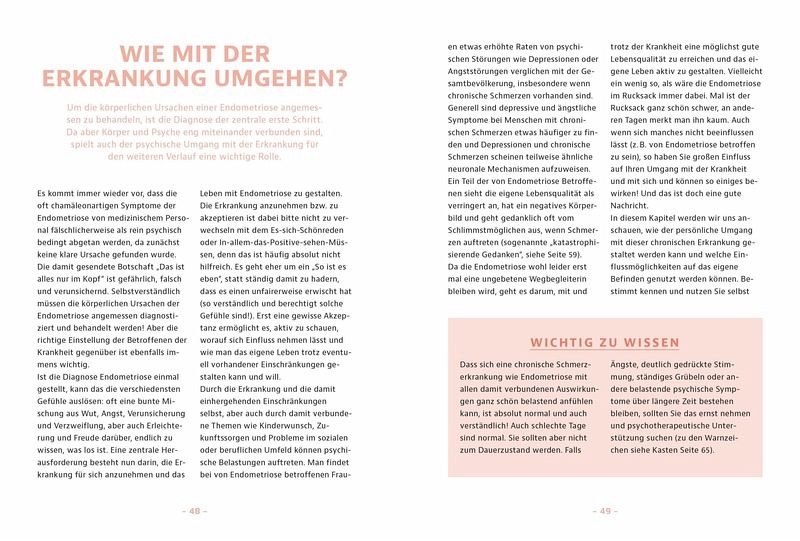 Nach der Diagnose "Endometriose" haben die betroffenen Frauen meist viele Fragen: Wie kann mir mein Arzt bzw. meine Ärztin nun helfen? Was kann ich selbst gegen die immer wiederkehrenden Schmerzen tun? Und wie steht es überhaupt um meinen Kinderwunsch? Diese und viele weitere Fragen beantwortet Prof. Dr. Mechsner in diesem Ratgeber auf gewohnt kompetente und einfühlsame Weise. Und mehr noch: Mit ihrem Wissen und ihrer Erfahrung aus der Endometriose-Forschung hat sie einen ganzheitlichen Ansatz entwickelt, der auf den drei Säulen Ernährung, Bewegung und mentalen Bewältigungsstrategien basiert und allen Betroffenen zu mehr Lebensqualität verhelfen kann.