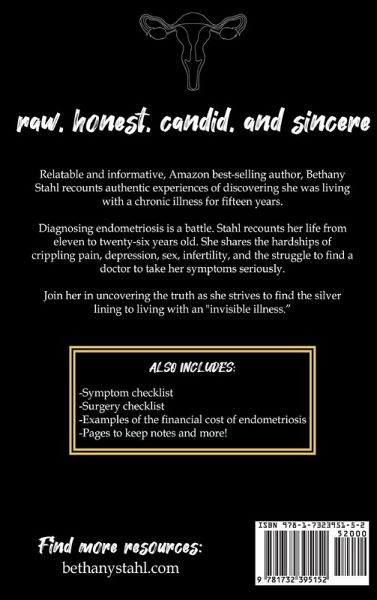 Relatable and informative, Amazon best-selling author, Bethany Stahl recounts authentic experiences of discovering she was living with a chronic disease for fifteen years. Diagnosing of Endometriosis is a battle. Stahl recounts her life from eleven to twenty-six years old. She shares the hardships of crippling pain, depression, sex, infertility, and the struggle to find a doctor to take her symptoms seriously. Join her in uncovering the truth as she strives to find silver-lining to living with an invisible disease.