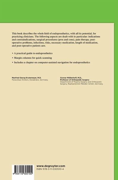 This book describes the whole field of endoprosthetics, with all its potential, for practicing clinicians. The following aspects are dealt with in particular: indications and contraindications, surgical procedures (pros and cons), pain therapy, post-operative problems, infections, risks, necessary medication, length of medication, and post-operative patient care.