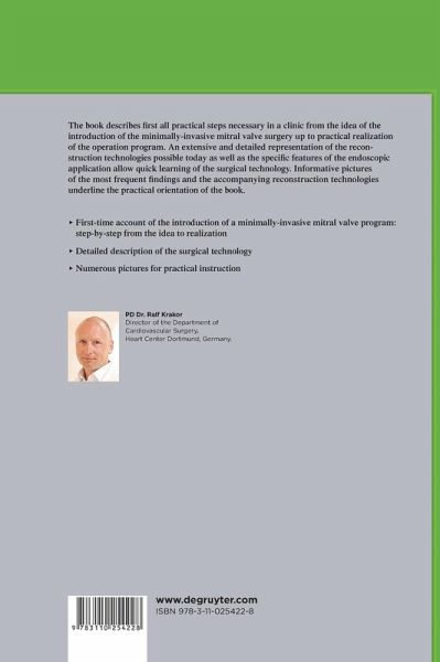 The minimally-invasive or endoscopic mitral valve surgery is one of the most attractive and most interesting areas of the modern heart surgery. The book describes first all practical steps necessary in a clinic from the idea of the introduction of the minimally-invasive mitral valve surgery up to practical realization of the operation program. The initial explanation of organizational and financial aspects allows an exact resource planning and protects against wrong expectations and failures. An extensive and detailed representation of the reconstruction technologies possible today as well as the specific features of her endoscopic application allow quick learning of the surgical technology. Numerous tips and tricks and informative pictures of the most frequent findings and the accompanying reconstruction technologies underline the practical orientation of the book.