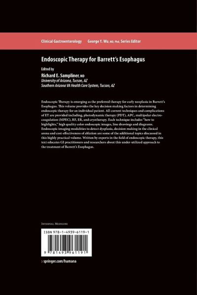 Endoscopic Therapy is emerging as the preferred therapy for early neoplasia in Barrett's Esophagus. This volume provides the key decision making factors in determining endoscopic therapy for an individual patient. All current techniques and complications of ET are provided including, photodynamic therapy (PDT), APC, multipolar electrocoagulation (MPEC), RF, ER, and cryotherapy. Each technique includes "how to highlights", high quality color endoscopic images, line drawings and diagrams. Endoscopic imaging modalities to detect dysplasia, decision making in the clinical arena and cost-effectiveness of ablation are some of the additional topics discussed in this highly practical volume. Written by experts in the field of endoscopic therapy, this text educates GI practitioners and researchers about this under-utilized approach to the treatment of Barrett's Esophagus.