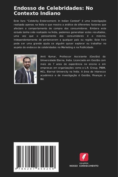 Este livro ¿Celebrity Endorsement: In Indian Context¿ é uma investigação realizada apenas na Índia e que mostra a análise de diferentes factores que afectam o comportamento de compra dos consumidores. Embora este estudo tenha sido realizado na Índia, podemos generalizar estes resultados, uma vez que o pensamento dos consumidores é o mesmo, independentemente de pertencerem a qualquer país ou região. Este livro pode ser uma grande ajuda se alguém quiser explorar ou trabalhar no aspeto do endosso de celebridades no Marketing e na Publicidade.
