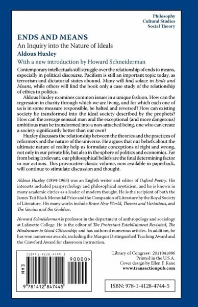 Contemporary intellectuals still struggle over the relationship of ends to means, especially in political discourse. Pacifism is still an important topic today, as terrorism and dictatorial states abound. Many will find solace in Ends and Means, while others will find the book only a case study of the relationship of ethics to politics.