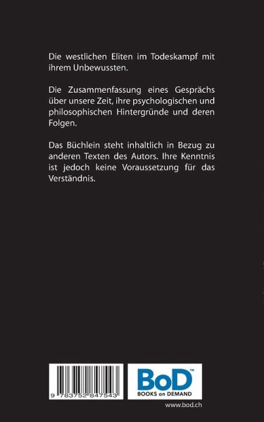 Die westlichen Eliten im Todeskampf mit ihrem Unbewussten.Die Zusammenfassung eines Gesprächs über unsere Zeit, über ihre psychologischen und philosophischen Wurzeln und Konnotationen. Das Büchlein steht inhaltlich in Bezug zu anderen Texten des Autors. Ihre Kenntnis ist jedoch nicht Voraussetzung.