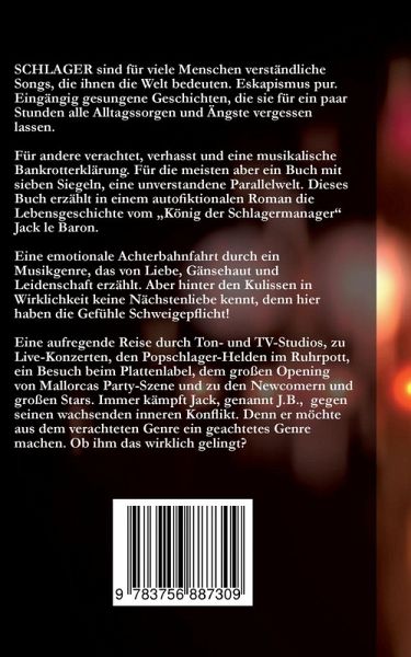 SCHLAGER sind für viele Menschen Songs, die ihnen die Welt bedeuten. Eskapismus pur. Eingängig gesungene Geschichten, die sie für ein paar Stunden alle Alltagssorgen und Ängste vergessen lassen. Für andere verachtet, verhasst und eine musikalische Bankrotterklärung. Für die meisten aber ein Buch mit sieben Siegeln, eine unverstandene Parallelwelt. Dieses Buch erzählt in einem autofiktionalen Roman die Lebensgeschichte vom "König der Schlagermanager" Jack le Baron. Eine emotionale Achterbahnfahrt durch ein Musikgenre, das von Liebe, Gänsehaut und Leidenschaft erzählt. Aber hinter den Kulissen in Wirklichkeit keine Nächstenliebe kennt, denn hier haben die Gefühle Schweigepflicht! Eine aufregende Reise durch Ton- und TV-Studios, zu Live-Konzerten, den Popschlager-Helden im Ruhrpott, ein Besuch beim Plattenlabel, dem großen Opening von Mallorcas Party-Szene und zu den Newcomern und großen Stars. Immer kämpft Jack, genannt "j.B.", gegen seinen wachsenden inneren Konflikt. Denn er möchte aus dem verachteten Genre ein geachtetes Genre machen. Ob ihm das wirklich gelingt?