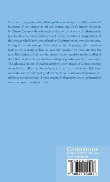 Hebrews 12: 1-13 portrays the suffering of the community to which it is addressed by means of two images: an athletic contest, and God's fatherly discipline. In this 1998 book, N. Clayton Croy provides a thorough exploration of the theme of suffering in the Jewish and Graeco-Roman traditions, and surveys the different interpretations of this passage which have been offered by Christian writers over the centuries. He argues that the concept of 'training' unites the passage, which presents Jesus as the supreme athlete, an agonistic exemplar for those running the race. These verses also support a non-punitive understanding of discipline, in which God's children undergo a positive process of education. The educative notion of paideia combines with images of athletic training to establish a call to faithful endurance rather than repentance.