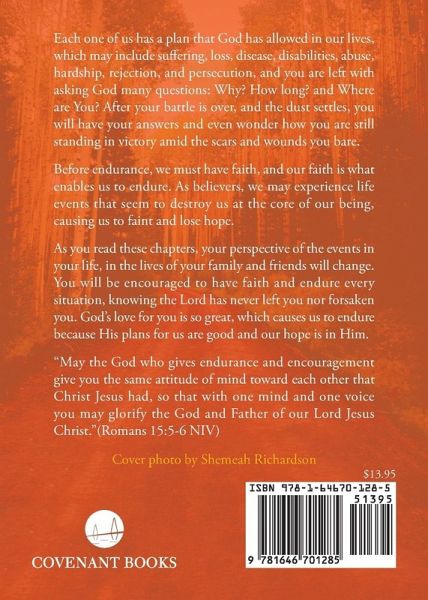Each one of us has a plan that God has allowed in our lives, which may include suffering, loss, disease, disabilities, abuse, hardship, rejection, and persecution, and you are left with asking God many questions: Why? How long? and Where are You? After your battle is over, and the dust settles, you will have your answers and even wonder how you are still standing in victory amid the scars and wounds you bare. Before endurance, we must have faith, and our faith is what enables us to endure. As believers, we may experience life events that seem to destroy us at the core of our being, causing us to faint and lose hope. As you read these chapters, your perspective of the events in your life, in the lives of your family and friends will change. You will be encouraged to have faith and endure every situation, knowing the Lord has never left you nor forsaken you. God’s love for you is so great, which causes us to endure because His plans for us are good and our hope is in Him. "How do you stand during the trials and tribulations that are experienced during the course of your life? God gives you endurance and encouragement so that you ultimately glorify Him" (Romans 15:5–6, NIV).
