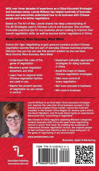 With over three decades of experience as a China-Educated Strategist and business owner, Leonie McKeon has helped hundreds of business owners and executives understand how to do business with Chinese people and to be better negotiators. Based on The Art of War, Leonie shares her deep understanding of the 36 Strategies used in Chinese culture and business. She provides invaluable practical tips for any business person looking to improve their overall negotiation skills, as well as become better negotiators in China. More Control, More Success, More Wins! Endure the tiger: Negotiating to gain ground contains ancient Chinese negotiation secrets that are part of everyday Chinese business practices. Discover how you too can use this ancient wisdom so you can have More Control, More Success, More Wins! · Understand the rules of the game of negotiation · Become a great negotiator anywhere, any time · Learn how to respond when Chinese negotiation tactics are used on you · Master the ancient secrets of negotiation so you remain in control · Implement culturally appropriate strategies for doing business in China · Avoid the traps of classic Chinese negotiation strategies · Take more control of every negotiation · Get more success in business · Win more in business