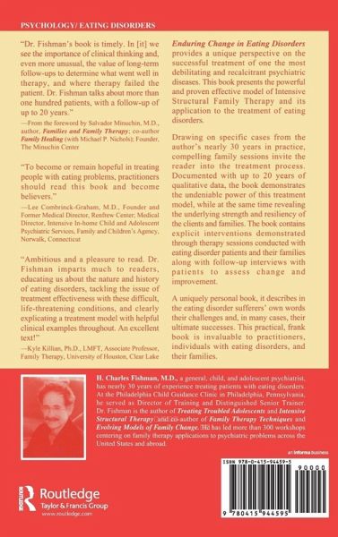 "Enduring Change in Eating Disorders provides a unique perspective on the successful treatment of eating disorders, which are among the most debilitating and recalcitrant psychiatric diseases. Unique in the field, this book details effective Structural Family therapy with qualitative follow-ups of up to 20 years. A practical approach providing concrete tools to the clinician to creating change that holds over time with bulimia, anorexia, and compulsive overeating. The text draws on cases from the author's practice of over twenty-five years and follow his approach in the theoretical tradition of Intensive Structural Family Therapy (IST). Chapters discuss the nature and significance of eating disorders, a review of current treatment approaches, and the importance of the family in the therapeutic process. Cases of eating disorders in youths and adults are provided as well as instances of bulimia, anorexia, and compulsive overeating. Three appendices provide the reader with information regarding the scientific basis of the IST model, the effectiveness of the approach in treating conditions other thank eating disorders and preventing eating disorders.