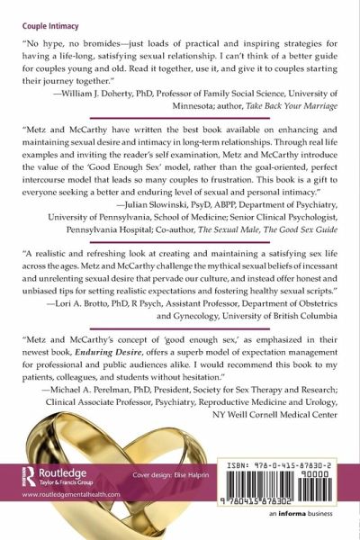 In Enduring Desire, authors Michael Metz and Barry McCarthy inspire and motivate readers with real-life examples and clear, helpful individual and couple exercises to reach for realistic and high quality sexual satisfaction as a couple.