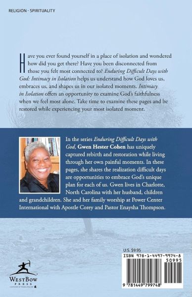 Have you ever found yourself in a place of isolation and wondered how did you get there? Have you been disconnected from those you felt most connected to? Enduring Difficult Days with God: Intimacy in Isolation helps us understand how God loves us, embraces us, and shapes us in our isolated moments. Intimacy in Isolation offers an opportunity to examine God's faithfulness when we feel most alone. Take time to examine these pages and be restored while experiencing your most isolated moment.