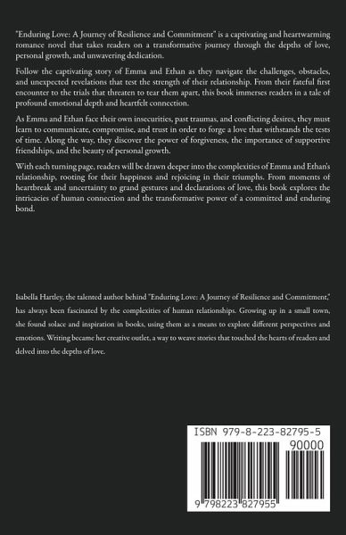 "Enduring Love: A Journey of Resilience and Commitment" is a captivating and heartwarming romance novel that takes readers on a transformative journey through the depths of love, personal growth, and unwavering dedication. Follow the captivating story of Emma and Ethan as they navigate the challenges, obstacles, and unexpected revelations that test the strength of their relationship. From their fateful first encounter to the trials that threaten to tear them apart, this book immerses readers in a tale of profound emotional depth and heartfelt connection. As Emma and Ethan face their own insecurities, past traumas, and conflicting desires, they must learn to communicate, compromise, and trust in order to forge a love that withstands the tests of time. Along the way, they discover the power of forgiveness, the importance of supportive friendships, and the beauty of personal growth. With each turning page, readers will be drawn deeper into the complexities of Emma and Ethan's relationship, rooting for their happiness and rejoicing in their triumphs. From moments of heartbreak and uncertainty to grand gestures and declarations of love, this book explores the intricacies of human connection and the transformative power of a committed and enduring bond. "Enduring Love: A Journey of Resilience and Commitment" is a poignant and inspiring tale that reminds us that love is not just a destination but an ongoing journey of self-discovery, vulnerability, and shared dreams. This book will touch the hearts of readers, leaving them with a renewed belief in the enduring power of love and the strength found within the commitment of two souls intertwined.