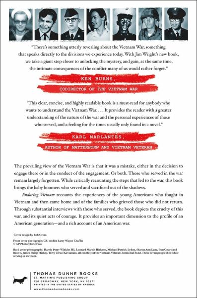 A history of the American War in Vietnam that provides a rich overview of that war and an evocative reminder of the human faces of the generation who served. The Vietnam War is largely recalled as a mistake, either in the decision to engage there or in the nature of the engagement. Or both. Veterans of the war remain largely anonymous figures, accomplices in the mistake. Critically recounting the steps that led to the war, this book does not excuse the mistakes, but it brings those who served out of the shadows. Enduring Vietnam recounts the experiences of the young Americans who fought in Vietnam and of families who grieved those who did not return. By 1969 nearly half of the junior enlisted men who died in Vietnam were draftees. And their median age was 21-among the non-draftees it was only 20. The book describes the "baby boomers" growing up in the 1950s, why they went into the military, what they thought of the war, and what it was like to serve in "Nam." And to come home. With a rich narrative of the Battle for "Hamburger Hill," and through substantial interviews with those who served, the book depicts the cruelty of this war, and its quiet acts of courage. James Wright's Enduring Vietnam provides an important dimension to the profile of an American generation-and a rich account of an American War.