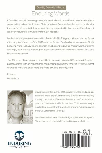 It feels like our world is moving in new, uncertain directions and in unknown waters where you need a good anchor. In Jesus Christ, who is our Rock, we have hope as an anchor for the soul. To not be set adrift, one needs to stay connected to that anchor. I have found it is only by regular time in God's Word that it happens. We believe the promise recorded in 1 Peter 1:24-25: The grass withers, and its flower falls away, but the word of the LORD endures forever. Day by day, as we come to God's Enduring Word, He has wisdom, strength, and blessing to give us. We can weather storms and enjoy calm waters. We can grow in seasons of drought and bear a harvest for God's kingdom year-round. For 25 years I have prepared a weekly devotional. Here are 365 selected Scripture passages along with an inspirational, encouraging, and helpful thought. My prayer is that you would know and enjoy more and more of God's enduring word. In Jesus, David Guzik