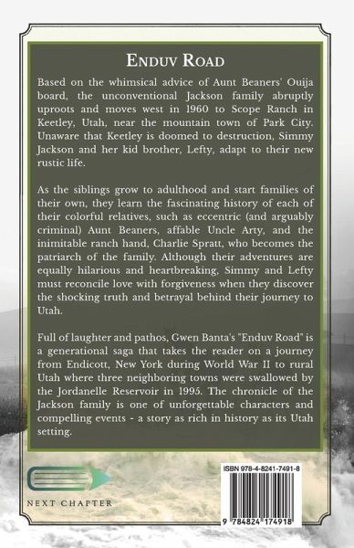 Based on the whimsical advice of Aunt Beaners' Ouija board, the unconventional Jackson family abruptly uproots and moves west in 1960 to Scope Ranch in Keetley, Utah, near the mountain town of Park City. Unaware that Keetley is doomed to destruction, Simmy Jackson and her kid brother, Lefty, adapt to their new rustic life. As the siblings grow to adulthood and start families of their own, they learn the fascinating history of each of their colorful relatives, such as eccentric (and arguably criminal) Aunt Beaners, affable Uncle Arty, and the inimitable ranch hand, Charlie Spratt, who becomes the patriarch of the family. Although their adventures are equally hilarious and heartbreaking, Simmy and Lefty must reconcile love with forgiveness when they discover the shocking truth and betrayal behind their journey to Utah. Full of laughter and pathos, Gwen Banta's "Enduv Road" is a generational saga that takes the reader on a journey from Endicott, New York during World War II to rural Utah where three neighboring towns were swallowed by the Jordanelle Reservoir in 1995. The chronicle of the Jackson family is one of unforgettable characters and compelling events - a story as rich in history as its Utah setting.