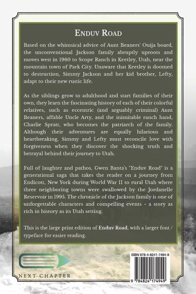 Based on the whimsical advice of Aunt Beaners' Ouija board, the unconventional Jackson family abruptly uproots and moves west in 1960 to Scope Ranch in Keetley, Utah, near the mountain town of Park City. Unaware that Keetley is doomed to destruction, Simmy Jackson and her kid brother, Lefty, adapt to their new rustic life. As the siblings grow to adulthood and start families of their own, they learn the fascinating history of each of their colorful relatives, such as eccentric (and arguably criminal) Aunt Beaners, affable Uncle Arty, and the inimitable ranch hand, Charlie Spratt, who becomes the patriarch of the family. Although their adventures are equally hilarious and heartbreaking, Simmy and Lefty must reconcile love with forgiveness when they discover the shocking truth and betrayal behind their journey to Utah. Full of laughter and pathos, Gwen Banta's "Enduv Road" is a generational saga that takes the reader on a journey from Endicott, New York during World War II to rural Utah where three neighboring towns were swallowed by the Jordanelle Reservoir in 1995. The chronicle of the Jackson family is one of unforgettable characters and compelling events - a story as rich in history as its Utah setting. This is the large print edition of Enduv Road, with a larger font / typeface for easier reading.