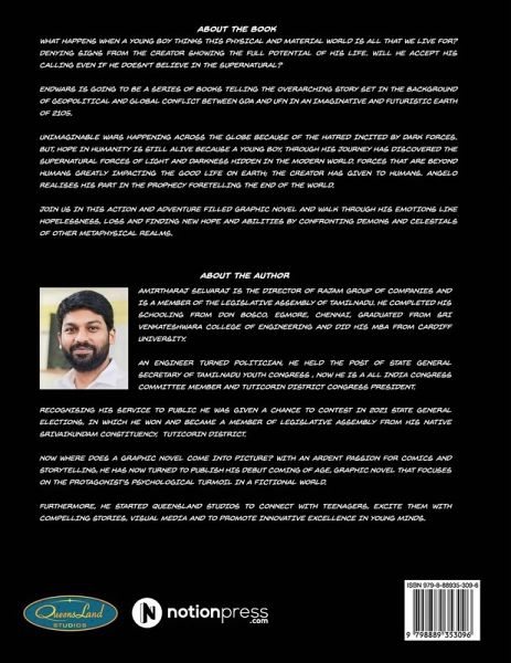 WHAT HAPPENS WHEN A YOUNG BOY THINKS THIS PHYSICAL AND MATERIAL WORLD IS ALL THAT WE LIVE FOR? DENYING SIGNS FROM THE CREATOR SHOWING THE FULL POTENTIAL OF HIS LIFE. WILL HE ACCEPT HIS CALLING EVEN IF HE DOESN'T BELIEVE IN THE SUPERNATURAL? ENDWARS IS GOING TO BE A SERIES OF BOOKS TELLING THE OVERARCHING STORY SET IN THE BACKGROUND OF GEOPOLITICAL AND GLOBAL CONFLICT BETWEEN GDA AND UFN IN AN IMAGINATIVE AND FUTURISTIC EARTH OF 2105. UNIMAGINABLE WARS HAPPENING ACROSS THE GLOBE BECAUSE OF THE HATRED INCITED BY DARK FORCES. BUT, HOPE IN HUMANITY IS STILL ALIVE BECAUSE A YOUNG BOY, THROUGH HIS JOURNEY HAS DISCOVERED THE SUPERNATURAL FORCES OF LIGHT AND DARKNESS HIDDEN IN THE MODERN WORLD. FORCES THAT ARE BEYOND HUMANS GREATLY IMPACTING THE GOOD LIFE ON EARTH; THE CREATOR HAS GIVEN TO HUMANS. ANGELO REALISES HIS PART IN THE PROPHECY FORETELLING THE END OF THE WORLD. JOIN US IN THIS ACTION AND ADVENTURE FILLED GRAPHIC NOVEL AND WALK THROUGH HIS EMOTIONS LIKE HOPELESSNESS, LOSS AND FINDING NEW HOPE AND ABILITIES BY CONFRONTING DEMONS AND CELESTIALS OF OTHER METAPHYSICAL REALMS.
