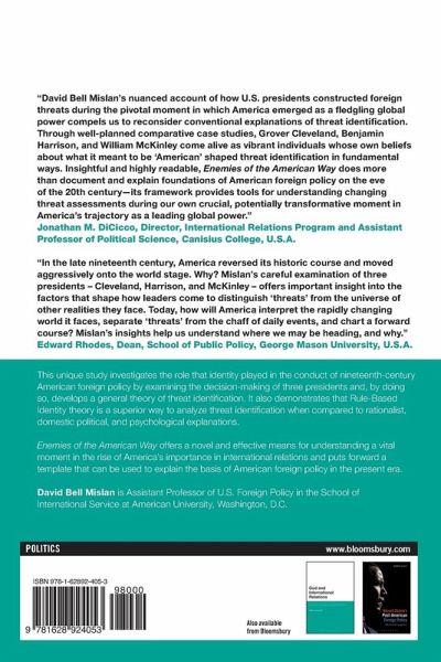 Why do presidents, when facing the same circumstances, focus on different threats to national security? Enemies of the American Way attempts to answer this question by investigating the role of identity in presidential decision making. The book explains why presidents disagree on what constitute a threat to the US security via the study of three US presidencies in the 19th century (Cleveland, Harrison and McKinley). These case studies help draw a theory of threat identification to understand how and why specific actions are taken, including the decision to wage war. Using a constructivist approach, the book develops a rule-based identity theory to posit that American identity defines potential national security threats, i.e., how a policymaker defines Americans also defines the threats to Americans. Enemies of the American Way offers a new means of understanding a key period when America rose to prominence in international relations while proposing a template that can be used to explain American foreign policy today. It will appeal to students of international relations and foreign policy.