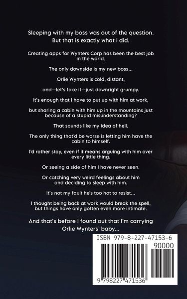 Sleeping with my boss was out of the question. But that is exactly what I did. Creating apps for Wynters Corp has been the best job in the world. The only downside is my new boss... Orlie Wynters is cold, distant, and-let's face it-just downright grumpy. It's enough that I have to put up with him at work, but sharing a cabin with him up in the mountains just because of a stupid misunderstanding? That sounds like my idea of hell. The only thing that'd be worse is letting him have the cabin to himself. I'd rather stay, even if it means arguing with him over every little thing. Or seeing a side of him I have never seen. Or catching very weird feelings about him and deciding to sleep with him. It's not my fault he's too hot to resist... I thought being back at work would break the spell, but things have only gotten even more intimate. And that's before I found out that I'm carrying Orlie Wynters' baby...