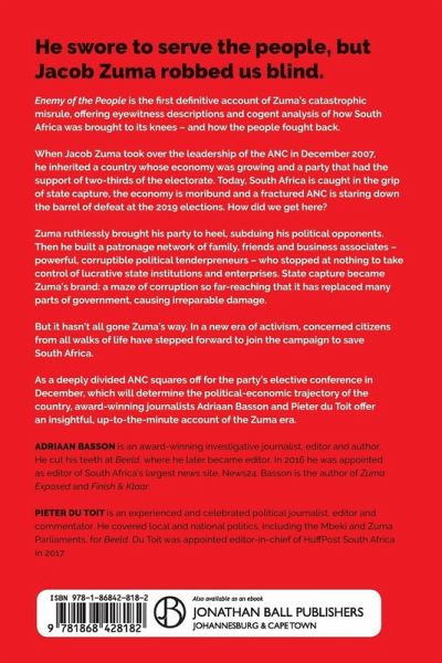 Enemy of the People is the first definitive account of Zuma's catastrophic misrule, offering eyewitness descriptions and cogent analysis of how South Africa was brought to its knees - and how a people fought back. When Jacob Zuma took over the leadership of the ANC one muggy Polokwane evening in December 2007, he inherited a country where GDP was growing by more than 6% per annum, a party enjoying the support of two-thirds of the electorate, and a unified tripartite alliance. Today, South Africa is caught in the grip of a patronage network, the economy is floundering and the ANC is staring down the barrel of a defeat at the 2019 general elections. How did we get here? Zuma first brought to heel his party, Africa's oldest and most revered liberation movement, subduing and isolating dissidents associated with his predecessor Thabo Mbeki. Then saw the emergence of the tenderpreneur and those attempting to capture the state, as well as a network of family, friends and business associates that has become so deeply embedded that it has, in effect, replaced many parts of government. Zuma opened up the state to industrial-scale levels of corruption, causing irreparable damage to state enterprises, institutions of democracy, and the ANC itself. But it hasn't all gone Zuma's way. Former allies have peeled away. A new era of activism has arisen and outspoken civil servants have stepped forward to join a cross-section of civil society and a robust media. As a divided ANC square off for the elective conference in December, where there is everything to gain or to lose, award-winning journalists Adriaan Basson and Pieter du Toit offer a brilliant and up-to-date account of the Zuma era.