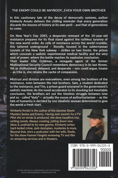 Trigger Warning: Torture, rape, graphic violence In this cautionary tale of the decay of democratic systems, author Kimberly Amato delivers the chilling reminder that every generation discards the lessons of history at its own peril - and that of generations to come. On New Year's Day 2045, a desperate remnant of the 20-year-old resistance prepares for its final stand against the ruthless tyranny of the new world order. As cells of resistance across the world crumble, this tattered underground - literally, housed in the subterranean tunnels of the New York subway - strikes on two fronts: the prison which conceals a sadistic experimental medical facility and the very seat of power, where the battle reaches its explosive conclusion. Their leader Ellie Goldman, a renegade agent of the former Multinational Security Council remembers democracy in its last throes. Yet as disillusioned, debased, and desperate - one could argue, insane - as Ellie is, she retains the cache of compassion. Amato has created a soul-grindingly brutal post-apocalyptic world where everybody is a potential enemy-anybody could turn you in to the authorities. Human life is worthless; women, useless except as receptacles. Skin color is a crime. The prisons are full of thought criminals, people of color, women, and rebels, overseen by guards whose fate has been determined by the state's assignment testing. Mistrust and division are everywhere, even among the brothers of the resistance, even between the real brothers, Sam, a student dedicated to the resistance, and Tim, a prison guard ensnared in the government's torturing, extremely violent and sadistic machine. As the novel accelerates to its shocking but inevitable conclusion, the brothers act out the timeless struggle between love and so-called "duty"-actually the noose of authoritarianism--as the fate of humanity is decided by one idealistic woman determined to give the world a fresh start.