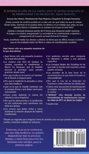 Si anhelas la vida de tus sueños pero te sientes atrapada en la mediocridad y la decepción, sigue leyendo. Incluye dos títulos: Manifestación Para Mujeres y Despierta Tu Energía Femenina. ¿Estás cansada de sentirte perdida en la vida y de ver que todos los que te rodean tienen éxito, mientras tú te quedas atrás: sin dinero, en un trabajo que odias, en una relación tóxica o atrapada en un cuerpo con el que no eres feliz? ¿Quizás a menudo bloqueas partes de ti misma que desearías poder expresar, te juzgas y te sientes avergonzada? La sociedad te ha condicionado a reprimir y avergonzarte de la parte sensual divina de ti misma. ¿Quieres finalmente decir adiós a todo tu tiempo perdido y ver qué es lo que realmente funciona para ti? Si es así, no es casualidad que estés leyendo esto. Verás, manifestar todos tus deseos y anhelos no tiene que ser difícil, incluso si sientes que ya has probado todos los libros y videos de manifestación posibles. De hecho, es más fácil de lo que piensas. Aquí tienes sólo una pequeña muestras de lo que descubrirás:La manera más fácil de hackear tu cerebro, aumentar el rendimiento y liberar los bloqueos que te impiden alcanzar la grandeza (¡que puedes practicar desde casa!) Los errores fatales que debes evitar para atraer a la pareja de tus sueños Guiones de Scripting hechos para ti: Nuevas y potentes plantillas de scripting fáciles de rellenar Por qué confiar en la suerte o el "destino" no te llevará a ninguna parte Por qué la modestia te perjudica y atrae una vida mediocre Cómo liberarte fácilmente de los traumas de tu vida y disparar tu vibración Qué es lo que te impide contactar con tu energía divina y qué debes sanar para solucionarlo Por qué las afirmaciones y la meditación no son suficientes para manifestar con éxito tus deseos Por qué perder el tiempo pensando en lo que deseas te está perjudicando Una poderosa guía de EFT para manifestar fácilmente tu verdadero amor Los errores que debes evitar y cómo mantener la relación después de haberla manifestado Un poderoso secreto para manipular tu vibración y atraer a esa persona específica Estas 20 nuevas y poderosas afirmaciones que harán que esa persona específica caiga en tus brazos Cómo enloquecer a los hombres con estos secretos de la divinidad femenina Los secretos de la fase lunar de la manifestación y lo que todo el mundo se está perdiendo Increíble ritual de manifestación diario hecho para ti: Simplemente practícalo en casa. Cómo crear una poción de manifestación recargada, con productos que tienes en tu cocina *BONUS* Una fórmula secreta de herramientas de manifestación: Incluye un vídeo de EFT, un diario (en Inglés) Y mucho más. Tómate un segundo para imaginar cómo te sentirás una vez que puedas manifestar tus sueños y hacerlos realidad sin esfuerzo. Imagina las caras de tus amigos y familiares cuando vean tu nueva y hermosa vida desarrollarse. Incluso si estás la ruina, deprimida o no has sido capaz de manifestarte en el pasado, puedes crear la vida de tus sueños a partir de hoy con los increíbles secretos contenidos aquí dentro. Tienes la llave para desbloquear literalmente cualquier cosa que hayas soñado en la vida. ¡Es hora de pasar a la acción! ¿Quieres acceder a profundidades asombrosas del amor propio, la aceptación, la fuerza interior y entrar en una relación de empoderamiento contigo misma? Entonces, si ya no te conformas con una vida mediocre, no quieres desperdiciar más tu precioso tiempo, y estás lista para vivir tus fantasías más salvajes, pasa la primera página.