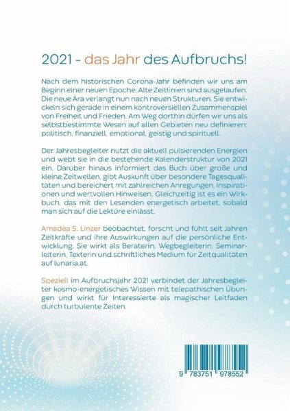 ENERGETISCHER JAHRESBEGLEITER 2021Ein Wirkbuch für ZeitreisendeNach dem historischen Corona-Jahr befinden wir uns 2021 am Beginn einer neuen Epoche. Alte Zeitlinien sind ausgelaufen. Die neue Ära verlangt nun nach neuen Strukturen. Sie entwickeln sich gerade in einem kontroversiellen Zusammenspiel von Freiheit und Frieden. Am Weg dorthin dürfen wir uns als selbst bestimmte Wesen auf allen Gebieten neu definieren: politisch, finanziell, emotional, geistig und spirituell. Der Jahresbegleiter nutzt die aktuell pulsierenden Energien und webt sie in die bestehende Kalenderstruktur von 2021 ein. Darüber hinaus informiert das Buch über große und kleine Zeitwellen, gibt Auskunft über besondere Tagesqualitäten und bereichert mit zahlreichen Anregungen, Inspirationen und wertvollen Hinweisen. Gleichzeitig ist es ein Wirkbuch, das mit den Lesenden energetisch arbeitet, sobald man sich auf die Lektüre einlässt. Speziell im Aufbruchsjahr 2021 verbindet der Jahresbegleiter kosmo-energetisches Wissen mit telepathischen Übungen und wirkt für Interessierte als Leitfaden in turbulenten Zeiten.