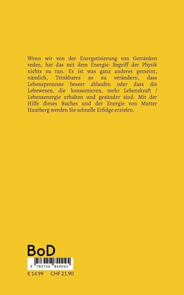 Wenn wir von der Energetisierung von Getränken reden, hat das mit dem Energie-Begriff der Physik nichts zu tun. Es ist was ganz anderes gemeint, nämlich, Trinkbares so zu verändern, dass Lebensprozesse besser ablaufen oder dass die Lebewesen, die konsumieren, mehr Lebenskraft / Lebensenergie erhalten und gesünder sind. Mit der Hilfe dieses Buches und der Energie von Mutter Hautberg werden Sie schnelle Erfolge erzielen.