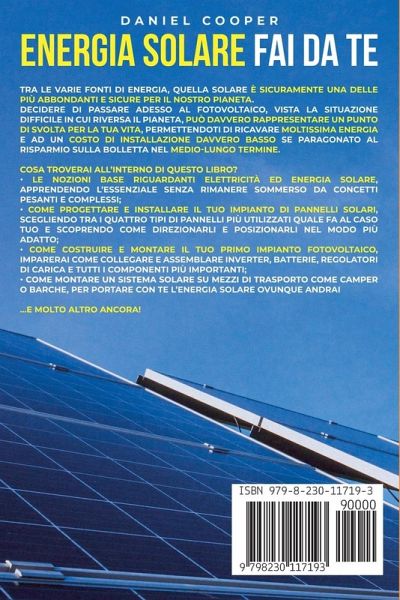 L'ansia di aprire la busta della bolletta a fine mese ha superato ogni record? Desideri trovare una soluzione alternativa, pulita, sostenibile ed economica che ti permetta di raggiungere l'indipendenza energetica? Tra le varie fonti di energia, quella solare è sicuramente una delle più abbondanti e sicure per il nostro pianeta: è a nostra disposizione ogni giorno, non inquina, è rinnovabile e non si esaurirà fino allo spegnimento del sole, non prima di altri 5 miliardi di anni! Decidere di passare adesso al fotovoltaico, vista la situazione difficile in cui riversa il pianeta, può davvero rappresentare un punto di svolta per la tua vita, permettendoti di ricavare moltissima energia e ad un costo di installazione davvero basso se paragonato al risparmio sulla bolletta nel medio-lungo termine. Tuttavia, la maggior parte dei libri che parlano di questo argomento risultano essere complicati e con un vocabolario molto tecnico, al punto che potresti iniziare a domandarti: "Riuscirei davvero ad occuparmi personalmente dell'installazione e della manutenzione dei pannelli, per ottenere un ulteriore risparmio su questo investimento?" La risposta è SI, "Energia Solare Fai Da Te" di Daniel Cooper è un manuale pratico scritto con un linguaggio semplice e intuitivo, che ti guiderà attraverso la progettazione e installazione del tuo primo impianto fotovoltaico! Cosa troverai all'interno di questo libro?Le nozioni base riguardanti elettricità ed energia solare, apprendendo l'essenziale senza rimanere sommerso da concetti pesanti e complessi; Quali sono gli strumenti fondamentali dei quali non potrai fare a meno mentre stai installando i tuoi pannelli; Come progettare il tuo impianto di pannelli solari, scegliendo tra i quattro tipi di pannelli più utilizzati quale fa al caso tuo e scoprendo come direzionarli e posizionarli nel modo più adatto; Come costruire e montare il tuo primo impianto fotovoltaico, imparerai come collegare e assemblare inverter, batterie, regolatori di carica e tutti i componenti più importanti; Come montare un sistema solare su mezzi di trasporto come camper o barche, per portare con te l'energia solare ovunque andrai ...E MOLTO ALTRO ANCORA! Dimenticherai l'ansia di aprire la busta contenente la tua prossima bolletta e avrai sufficiente energia da provvedere a tutti i tuoi consumi. Avrai anche la possibilità di viaggiare liberamente con un camper o una barca, non facendoti mai mancare nessuna comodità! Cosa aspetti? Fatti un regalo e inizia il tuo percorso verso l'indipendenza energetica!