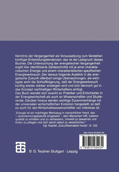Kenntnis der Vergangenheit als Voraussetzung zum Verstehen künftiger Entwicklungstendenzen: Das ist der Leitspruch dieses Buches. Die Untersuchung der energetischen Vergangenheit ergibt klar identifizierte Zeitabschnitte mit je einer charakteristischen Energie und einem charakteristischen spezifischen Energieverbrauch. Der daraus folgende Ausblick in die energetische Zukunft offenbart einige Überraschungen, als wichtigste wohl die Schlußfolgerung, daß der Energieverbrauch künftig wieder stärker ansteigen wird und sich dennoch gut in das Konzept nachhaltigen Wirtschaftens einfügt. Das Buch wendet sich sowohl an Praktiker und Entscheider in der Energiewirtschaft als auch an Wissenschaftler und Studierende. Darüber hinaus werden wichtige Zusammenhänge mit der universalen wirtschaftlichen Evolution hergestellt, so daß es auch für den Wirtschaftswissenschaftler von Interesse ist.