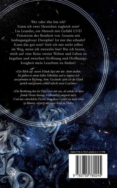 Wer oder was bin ich?Kann ich zwei Menschen zugleich sein?Lia Leander, ein Mensch mit Gefühl UND Prinzessin der Reinheit von Assunta mit bedingungsloser Disziplin? Ist mir das erlaubt? Kann das gut sein? Steh ich mir nicht selbst im Weg, wenn ich zweierlei bin? Bin ich bereit, mich auf eine Reise zweier Welten und Leben zu begeben und zwischen Hoffnung und Hoffnungslosigkeit mein Leuchten zu finden?»Ein Blick auf unsere Hände lässt mir den Atem stocken. Sie glühen in einem hellen Silberblau und es beginnt sich auszubreiten in Richtung Arm. Geschockt ziehe ich die Hand zurück und genauso schnell erlischt unser Leuchten.«»Die Berührung löst ein Déjà-vu in mir aus, als würde ich diese fremde Person kennen. Vertrautheit umgarnt mich. Und eine schreckliche Furcht, ohne dieses Gefühl nie mehr leben zu können, versetzt mir einen Kloß im Hals.«