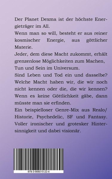 Der Planet Dexma ist der höchste Energieträger im All. Wenn man so will, besteht er aus reiner kosmischer Energie, aus göttlicher Materie. Jeder, dem diese Macht zukommt, erhält grenzenlose Möglichkeiten zum Machen, Tun und Sein im Universum. Sind Leben und Tod ein und dasselbe? Welche Macht haben wir, die wir noch nicht kennen oder die, die wir kennen? Wenn es keine Göttlichkeit gäbe, dann müsste man sie erfinden. Ein beispielloser Genre-Mix aus Realo/Historie, Psychedelic, SF und Fantasy. Voller ironischer und grotesker Hintersinnigkeit und dabei noch visionär. Hier gibt es Einiges zu entdecken.