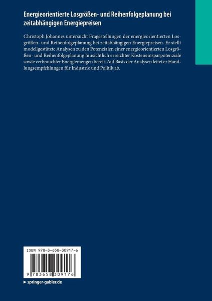 Christoph Johannes untersucht Fragestellungen der energieorientierten Losgrößen- und Reihenfolgeplanung bei zeitabhängigen Energiepreisen. Er stellt modellgestützte Analysen zu den Potenzialen einer energieorientierten Losgrößen- und Reihenfolgeplanung hinsichtlich erreichter Kosteneinsparpotenziale sowie verbrauchter Energiemengen bereit. Auf Basis der Analysen leitet er Handlungsempfehlungen für Industrie und Politik ab.