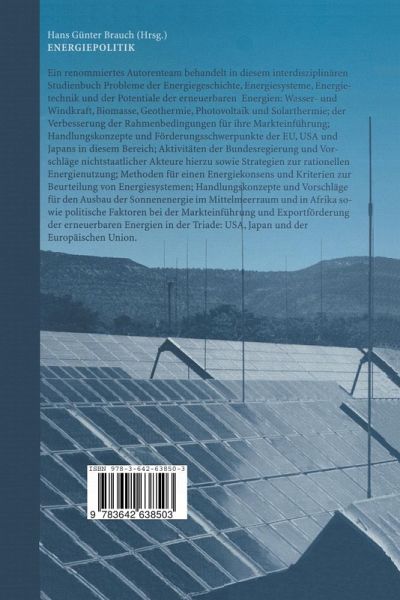 Ein renommiertes Autorenteam behandelt in diesem interdisziplinären Studienbuch Probleme der Energiegeschichte, Energiesysteme, Energietechnik und der Potentiale der erneuerbaren Energien: Wasser- und Windkraft, Biomasse, Geothermie, Photovoltaik und Solarthermie; der Verbesserung der Rahmenbedingungen für ihre Markteinführung; Handlungskonzepte und Förderungsschwerpunkte der EU, USA und Japans in diesem Bereich; Aktivitäten der Bundesregierung und Vorschläge nichtstaatlicher Akteure hierzu sowie Strategien zur rationellen Energienutzung; Methoden für einen Energiekonsens und Kriterien zur Beurteilung von Energiesystemen; Handlungskonzepte und Vorschläge für den Ausbau der Sonnenenergie im Mittelmeerraum und in Afrika sowie politische Faktoren bei der Markteinführung in der Triade: USA, Japan und der EU.