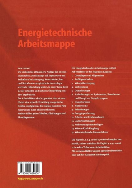 Die vorliegende Auflage der Energietechnischen Arbeitsmappe wird Ingenieuren und Technikern bei Auslegung, Konstruktion, Bau und Betrieb von energietechnischen Anlagen wertvolle Hilfestellung leisten. In erster Linie dient sie der schnellen und sicheren Überprüfung von Ergebnissen der Berechnungen. Die Arbeitsblätter sind so gestaltet, dass Sie dem Nutzer eine schnelle Ermittlung energetischer Größen ermöglichen; der Einfluss einzelner Parameter ist auf einen Blick zu erkennen. Weitere Hilfen geben Tabellen, Gleichungen und Flußdiagramme. Die Energietechnische Arbeitsmappe enthält Arbeitsblätter in den folgenden Kapiteln: 1. Grundlagen und Allgemeines, 2. Stoffeigenschaften, 3. Wärmeübertragung, 4. Verbrennung, 5. Dampferzeuger, 6. Anforderungen an speisewasser, Kesselwasser und Dampf vonf Dampferzeugern, 7. Dampfturbinen, 8. Kühlsysteme, 9. Rohrleitungen, 10. Energiespeicherung, 11. Arbeits- und Kraftmaschinen, 12. Gasturbinenanlaen, 13. Verbrennungsmotoranlagen, 14. Wärme-Kraft-Kopplung, 15. Wärmetechnische Meßverfahren. Die Kapitel 1.2, 2.4, 12 und 15 wurden komplett neu erstellt, zudem enthalten die Kapitel 3,4 , 9, 10, 11 in weiten Teilen neue Arbeitblätter. Alle weiteren Blätter wurden entweder überarbeitet oder auf ihre Aktualität hin überprüft.